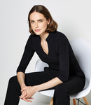 95% cotton/5% elastane. Regular fit. V neck and mandarin collar. Taped shoulder seams. Shaped side seams. Straight hem. Twin needle sleeves and hem.