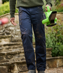 65% polyester/35% cotton. Water repellent finish. Part elasticated waistband with belt loops. Zip fly with button over. Two side patch pockets and two zip pockets with slanted entry. Rear pockets. Small coin pocket. Right leg zip pocket. Knee pad pockets. Reinforced crotch seam. Triple needle stitching. Cut out label. Knee pads available RG282.